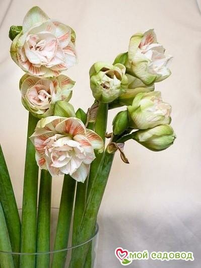 Прекрасный махровый амариллис с лепестками кремового цвета и кораллово-красными прожилками. Очень крупные цветы на прочном толстом цветоносе! До 14 лепестков с несколькими маленькими лепесточками или маленькими лепестками с остатками тычинок. Иногда также бывают нормальные тычинки. Луковица разбора 32/34 может дать две-три цветочные стрелки. На каждой стрелке по 4-5 цветков, диаметром 18-22 см. Высота цветоноса: 35-45 см. Цветение: круглый год. Высадка луковицы На дно горшка укладываем дренаж из керамзита или мелких камешков. Слой в 2 – 2,5 см. Сверху насыпаем землю, по центру ставим луковицу и засыпаем ее по бокам, оставляя верхнюю треть луковицы без земли. Поливаем отстоянной водой комнатной температуры. После посадки луковицы, примерно через месяц должно наступать цветение, которое будет продолжаться в течение 2-х или 3-х недель. Место Амариллис очень любит светлые открытые места. Идеально подойдут южные и юго-восточные окна. На лето можно высаживать в открытый грунт с южной стороны, в защищенном от ветров месте. Не любит сквозняков, особенно в зимнее время. Температура Во время бурного цветения, ему будет комфортно при температуре в +23 – 25 °C. В ночное время, допустимо снижение температуры до +18 – 20 °C. Чтобы продлить срок цветения, можно понизить температуру окружающей среды примерно до 18 °C и убрать излишнее освещение.