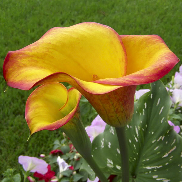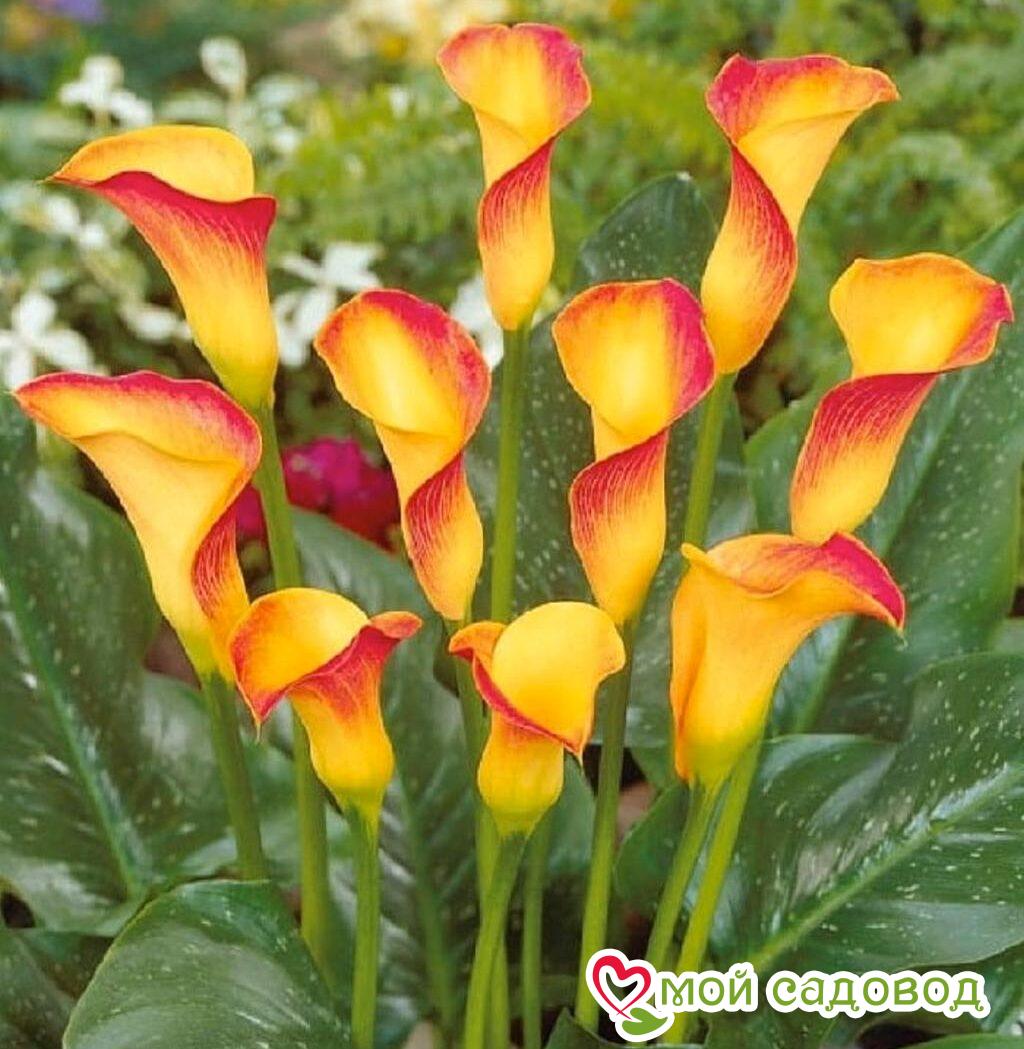 Калла Peach Chiffon способны наполнить сад яркими красками — ведь даже соцветие у этого сорта ярко-желтое. Лист большой и широкий, покрыт белыми мелкими пятнышками. Над зеленой листвой возвышаются цветоносы с крупными цветами. Они ярко-желтого цвета с красной размытой каймой по краю. Цветение каждого цветоноса длится от 2 до 4 недель. Растение любит солнечное место, но без попадания прямых солнечных лучей. Прекрасно растет в легком затенение. Каллу Peach Chiffon используют в срезке, озеленение и выращивают как горшечную культуру. Высота 50-60 см, размер цветка достигает 6–8 сантиметров в диаметре. Цветение июнь-сентябрь (в зависимости от срока высадки клубней). Количество цветков зависит от размера клубня, может быть от 3 до 10. ПОСАДКА М УХОД. Рано весной в горшки для комнатной культуры, в открытый грунт — после того, как минует угроза заморозков. Клубни  сажают на глубину 5-10 см и хорошо проливают почву, поскольку каллы любят влагу. Для посадки каллы подойдет притененный участок. Идеальный вариант, место под негустыми кронами деревьев. Чтобы было достаточно светло, а солнечные лучи не обжигали листьев. Очень эффектно смотрятся каллы, рядом с искусственным водоемом. Отлично цветет и растет только в тепле, где температура не ниже 18°C, самая оптимальная температура 22-23°C. Не переносит сквозняков. Цветоносы этого растения высокие, которые идут прямо от низа растения. На открытом воздухе это прекрасное растение цветет 1 месяц, а в закрытом помещении — 14 дней. Осенью растения сбрасывают листья. На зиму клубни каллы нужно выкопать и хранить в непромерзаемом помещении.