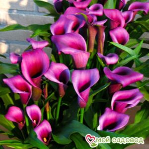 ПОСАДКА М УХОД. Рано весной в горшки для комнатной культуры, в открытый грунт — после того, как минует угроза заморозков. Клубни  сажают на глубину 5-10 см и хорошо проливают почву, поскольку каллы любят влагу. Для посадки каллы подойдет притененный участок. Идеальный вариант, место под негустыми кронами деревьев. Чтобы было достаточно светло, а солнечные лучи не обжигали листьев. Очень эффектно смотрятся каллы, рядом с искусственным водоемом. Отлично цветет и растет только в тепле, где температура не ниже 18°C, самая оптимальная температура 22-23°C. Не переносит сквозняков. Цветоносы этого растения высокие, которые идут прямо от низа растения. На открытом воздухе это прекрасное растение цветет 1 месяц, а в закрытом помещении — 14 дней. Осенью растения сбрасывают листья. На зиму клубни каллы нужно выкопать и хранить в непромерзаемом помещении.
