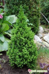 Колючая ель Глаука Второе название сорта – ель Сизая или ель Колючая. Родом он из Северной Америки. Это растение – непреходящая классика дизайна. Его выращивают во всех уголках Европы. Хвойник не особо требовательный к условиям произрастания, поэтому его культивируют как профессионалы, так и начинающие садоводы. Ботаническое описание Стройное дерево вырастает до 15 – 20 м в высоту. При правильной агротехнике некоторые экземпляры достигают 30 – 45 м. Крона у хвойника конусообразная, симметричная. Ветки прочные, размещённые в мутовках горизонтально. Такая особенность эффектно выделяет ярусную конфигурацию кроны. Последняя со временем поднимается и оголяет ствол. Благодаря крупной, густой хвое колючая ель Глаука одна из наиболее красивых представителей своей группы. Иголочки плотные по структуре, небольшого размера (2 – 3 см), четырёхгранные, сизого или зелёного цвета. Торчат в разных направлениях. Плоды – цилиндрические шишки, диаметром 3 см и длиной до 10 см. До вызревания они зеленковато-жёлтого оттенка. Далее плоды приобретают бледно-коричневую окраску. Поверхность у шишек смолистая. На деревцах они сохраняются до весны следующего года, и лишь незначительная часть осыпается осенью. Ель колючая Глаука по красоте ничем не уступает ели Сибирской. Однако в отличие от последней у неё меньше холодоустойчивость. На родине сохраняет жизнеспособность в течение 400 лет. В России теряет декоративные качества к 50 годам. Применение Саженцы ели колючей Глаука применяются для озеленения аллей, крупных жилых массивов, для сольных посадок и компактных куртин. Также растение используют для создания зелёных изгородей и простых геометрических фигур: пирамид, шаров и т. д. Многолетник гармонично дополнит парадные и мемориальные места, школьную территорию, детские игровые площадки. Его активно выращивают возле театров, выставочных центров, музеев, а также в регионах с загрязнённой экологией. Агротехника Рассада ели колючей Глаука довольно светолюбива. К почвенным условиям культура не слишком требовательна. Однако замечено, что лучше всего она развивается на хорошо увлажнённых землях (без длительного застоя воды). Профессионалы рекомендуют выбирать для хвойника плодородные суглинки и супесчаники, хорошо дренированные и со слабокислой реакцией. Участок под посадку саженцев подойдёт открытый и хорошо освещённый. Посадочная лунка должна превышать размеры контейнера, в котором рассада выращивалась в питомнике, в 1,5 – 2 раза. Почву в ёмкости нужно обильно полить. Если растения с открытой корневой системой – замочить корешки в стимуляторе роста (Эпин или Корневин). Важно, чтобы корневая шейка находилась на уровне поверхности грунта. Лунку наполняют смесью из извлечённой почвы и торфа в одинаковых пропорциях. Дополнительно вносят комплексную минеральную подкормку – на 1 л субстрата 5 г. Дальнейший уход за елью колючей Глаука включает регулярный полив. Корневище саженцев ещё не достаточно развито, чтобы самостоятельно добывать воду из земли. В последующие годы процедуру осуществляют в засушливую погоду 1 – 2 раза в неделю. Чтобы сократить испарение влаги следует замульчировать приствольную зону (древесными опилками или торфом). Подкормку рассады проводят 2 раза за сезон. В октябре используют препараты, содержащие калий и фосфор, а в апреле-м