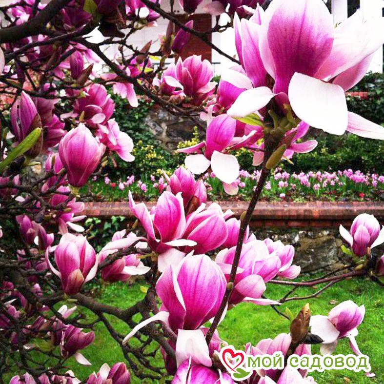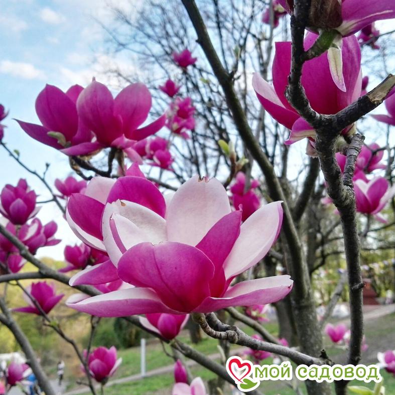 Цветки – крупные, (чем то похожие на тюльпаны), диаметром до 25 см, с неповторимым и хорошо ощущаемым даже на расстоянии ароматом. Окраска цветков, в зависимости от сорта, может быть чисто белой, нежно-розовой, пурпурной, красной и даже двухцветной. Цветет этот вид магнолии очень рано – в апреле-мае. При теплой весне цветение может начаться даже в марте.