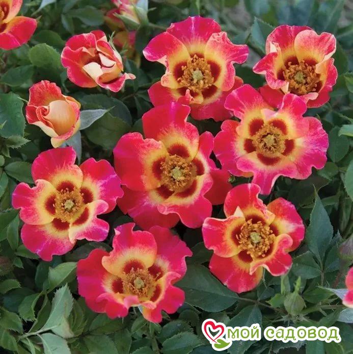 Цветки простые (4-8 лепестков), диаметром 5-10 см, жёлтые с красной каймой различных оттенков и тёмно-красным пятном в основании лепестков. Цветение обильное, повторное, до заморозков. Листва глянцевая, тёмно-зелёная, устойчивая к заболеваниям. Куст компактный, высотой 40-50 см. Рекомендуется как бордюрная, контейнерная или балконная роза. Хранение до посадки Как хранить растения, если вы получили посылку раньше начала посадочного сезона? Для хранения саженцев роз есть несколько простых правил: Если роза спит — храним в холодильнике или подвале при температуре от 0 до +4 °С, или на улице в коробке под толстым слоем снега. Если роза проснулась — прикопать в теплице или высадить в сад, обеспечив укрытие. Можно посадить розу в горшок и хранить в прохладном подвале или на балконе/лоджии, притеняя от прямых солнечных лучей. Во время хранения периодически проверяйте состояние посадочного материала. Поврежденные, загнившие части корней удалите и обработайте фунгицидом (Топаз, Фитоспорин).