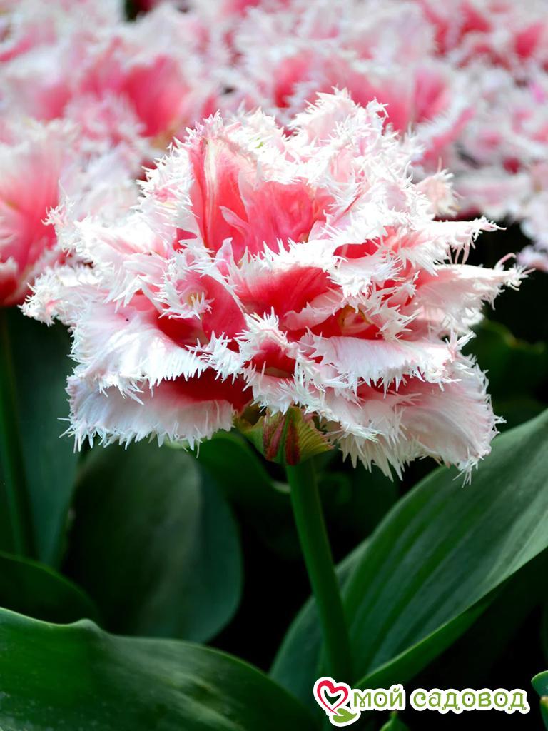 Тюльпан Квинсленд относится к бахромчатым сортам. Цветет тюльпан Квинсленд в апреле — начале мая, образуя высокий, 6-8 см нежно-розовый с шикарной белой бахрамой бутон. Отличительная особенность этих тюльпанов — игольчатая бахрома по краям лепестков, напоминающая иней. Форма цветка различная, неповторимая. Обладает тюльпан Квинсленд средней скоростью роста, подходит как для озеленения и украшения клумб, так и для букетов. Красивый бело-розовый цветок образуется на прочной ноге высотой 20-30 см. Легко размножается, дает прекрасную срезку.